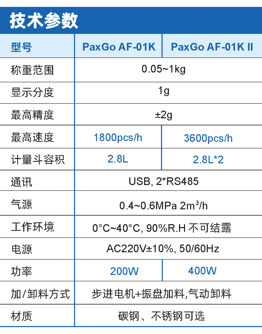 2、颗粒物料:专为小包颗粒物料包装设计,量程: 50g~1kg,适用于多种不同物料:大米、小米、豆类等食品;